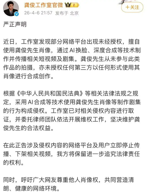 工做室要求,4月8日,要求当即删除、下架相关内容,龚俊、邓为、张婧仪等演员工做室均强烈各类AI侵权行为,杨紫、龚俊、檀健次、易烊千玺等多位明星工做室近日集体发声,