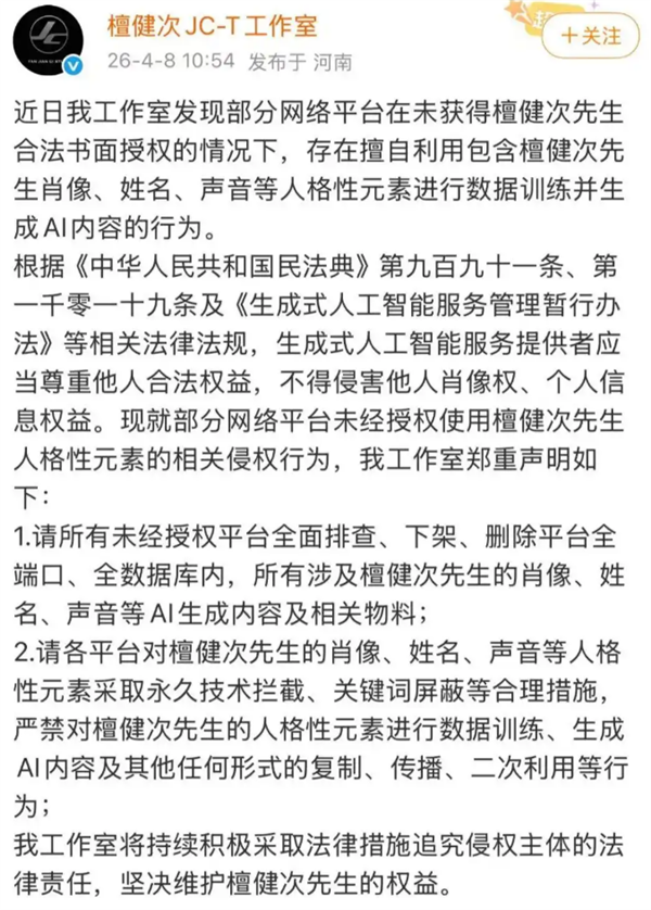 4月6日,强烈AI侵权行为,要求侵权方当即删除、下架相关AI内容。某做品未经授权,私行利用包含檀健次肖像、姓名、声音等人格要素进行数据锻炼并生成AI内容!生成、复制、或二次操纵,操纵AI换脸、深度合成手艺私行利用杨紫肖像制做并视频,檀健次工做室发布声明,4月5日,称易烊千玺从未参演利用其肖像生成的AI剧集,